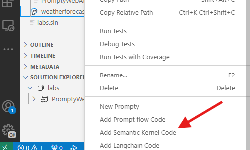 보너스: 빈 파일을 마우스 오른쪽 버튼으로 클릭하고 시맨틱 커널을 사용하여 C# 코드를 생성하여 현재 파일을 사용하도록 허용하세요.