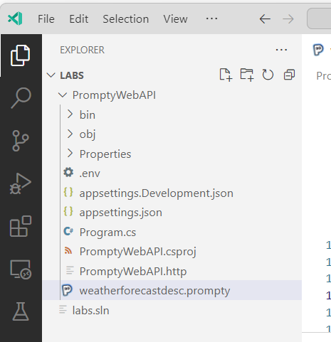 일기 예보는 날짜, 온도(C 및 F) 및 요약을 포함한 가상의 예보를 반환합니다. 우리의 목표는 더 자세한 요약을 생성할 수 있는 프롬프트를 만드는 것입니다. PromptyWebAPI 폴더의 루트에 새 빈 파일을 추가해 보겠습니다. 마우스 오른쪽 버튼을 클릭하고 새 빈을 선택하기만 하면 됩니다. 생성된 파일의 이름을 weatherforecastdesc.prompty로 변경합니다. 솔루션은 다음과 같이 표시됩니다: