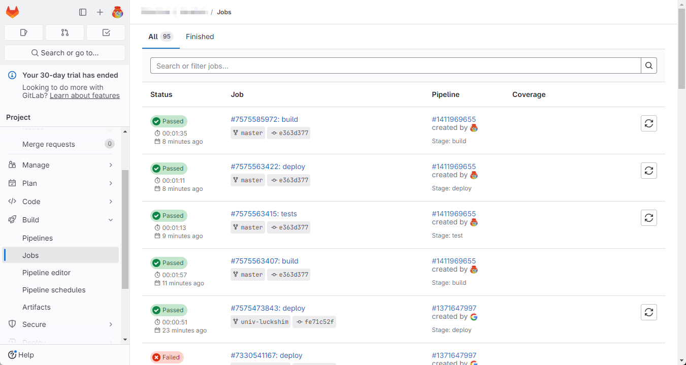 GitLab에서 커밋 후 파이프라인이 실행되면, 각 단계가 순차적으로 실행됩니다. 이 과정에서 GitLab은 각 작업이 성공했는지, 실패했는지 등을 기록하고, 최종 결과를 UI에서 확인할 수 있도록 보여줍니다. 이렇게 자동화된 CI/CD 파이프라인을 통해, 코드를 푸시할 때마다 일관된 빌드와 테스트, 배포 과정을 거칠 수 있습니다.