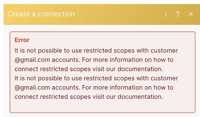 it is not possible to use restricted scopes with customer @gmail.com accounts. for more information on how to connect restricted scopes visit our documentation. it is not possible to use restricted scopes with customer @gmail.com accounts. for more information on how to connect restricted scopes visit our documentation.