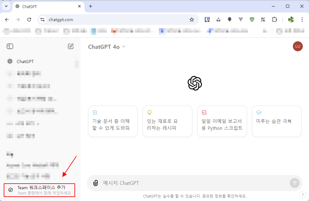 ChatGpt 유료 결제를 위해서는 왼쪽 하단에 있는 "Team 워크스페이스 추가"를 선택합니다.