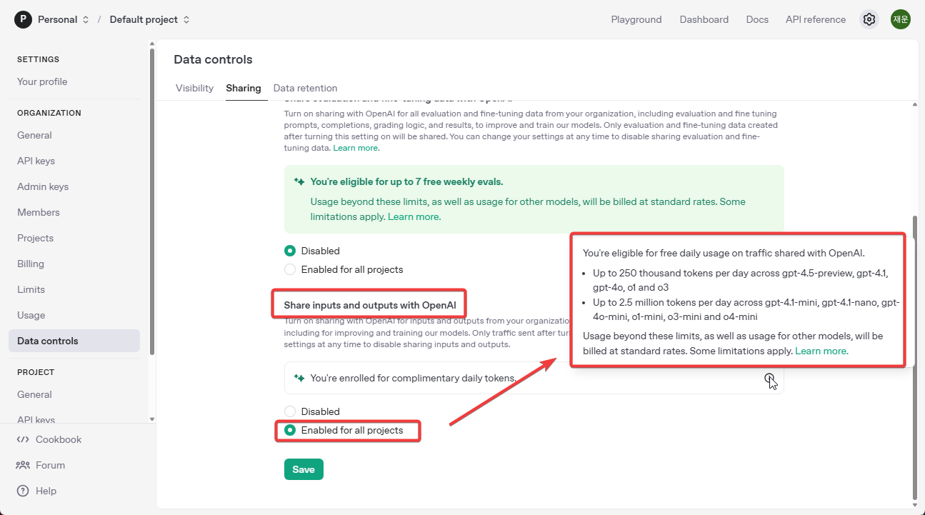 OpenAI의 조직 설정에서 Data Controls > Sharing > Share inputs and outputs with OpenAI 항목을 “Enabled for all projects”로 설정하면, 다음과 같은 일이 발생합니다.