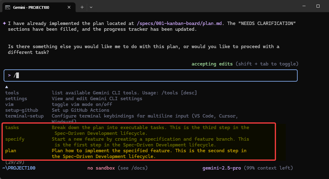 마지막으로, /tasks 명령어를 사용하여 AI 에이전트에게 세분화된 작업 목록을 생성하도록 요청하고, 이 목록을 기반으로 실제 코드를 작성하게 합니다.