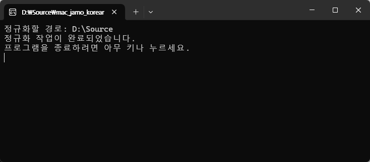 - EXE 파일을 실행하면, 자동으로 현재 디렉토리와 모든 하위 디렉토리의 파일명과 폴더명을 NFC 형식으로 정규화합니다.