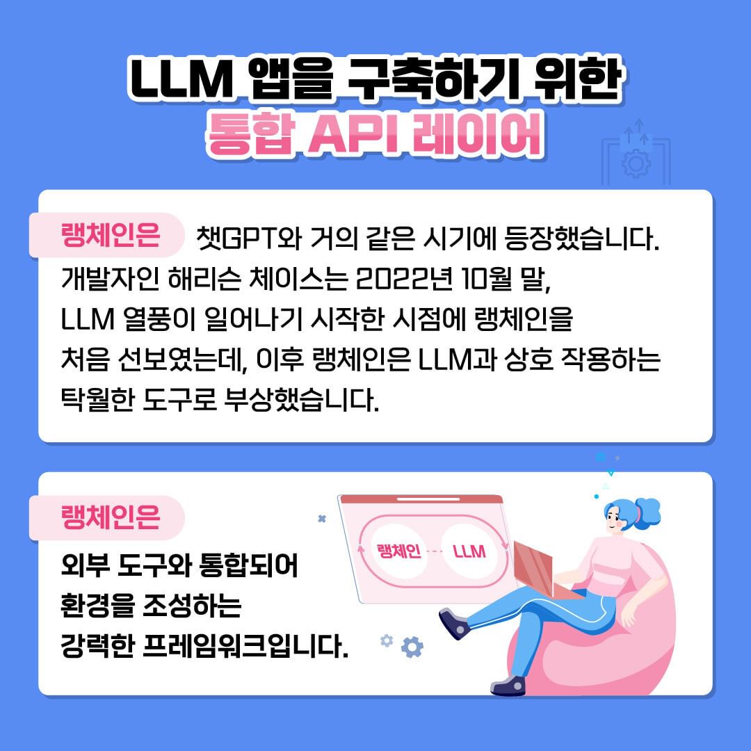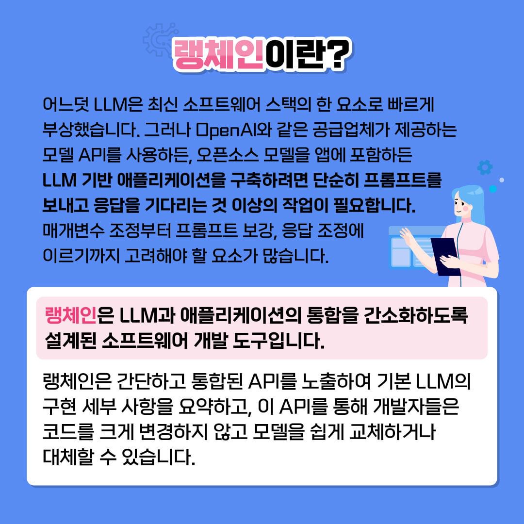 랭체인(LangChain)은 대규모 언어 모델(LLM)을 활용해 쉽게 애플리케이션을 만들 수 있도록 도와주는 도구입니다. LLM을 사용하면 GPT-4나 다른 AI 모델을 이용해 자연어로 대화를 하거나 데이터를 분석할 수 있습니다. 랭체인은 이런 LLM을 애플리케이션과 연결하는 작업을 훨씬 더 쉽게 만들어 줍니다.