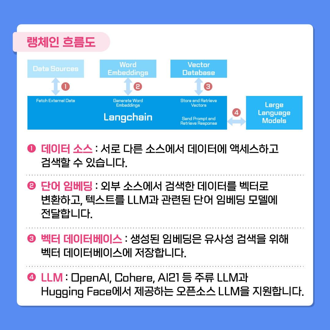 - LLM은 단어와 문장을 이해할 때, 이를 숫자로 변환하는데 이를 단어 임베딩이라고 합니다. 랭체인은 데이터를 임베딩으로 변환한 뒤, 검색이 용이하도록 벡터 데이터베이스에 저장합니다. 이렇게 하면 LLM이 기존 데이터를 효과적으로 검색하고 유사성을 찾아낼 수 있게 됩니다.